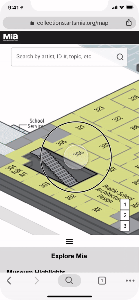 On the collections site is a map of the museum’s galleries which can be searched to reveal which artworks are displayed in any given gallery. Using this existing information, and the knowledge that it is kept up to date as pieces are relocated within Mia’s collection helped us to direct our prototyping to develop an interactive map. Using the map as a starting point visitors will be able wander and discover something that sparks their interest, as well as find something they came to see. The map can also be used to display wayfinding aids for curated journey’s or thematic tours.