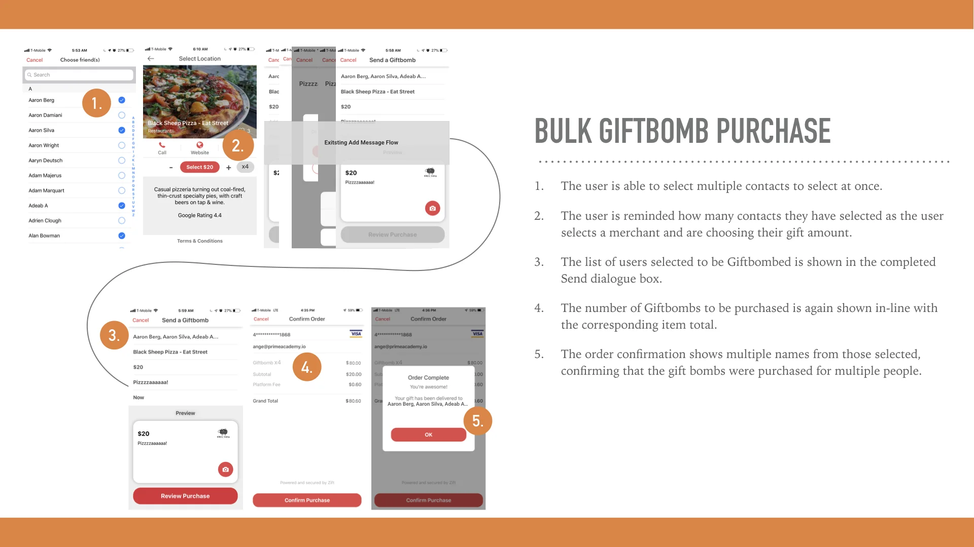 This gave us the contextual information and perspective needed to make recommendations on new app features. As a design team we quickly developed about 100 new feature prototypes, and grouped them together in similar categories to be reviewed by Giftbomb’s founder and developers. The goal of this meeting was to understand the complexity of the features we proposed and the development costs to bring them to market. The development time allotted for the next round of feature rollout was 6-8 weeks. Based on this feedback and these constraints I chose the following three features to prototype.