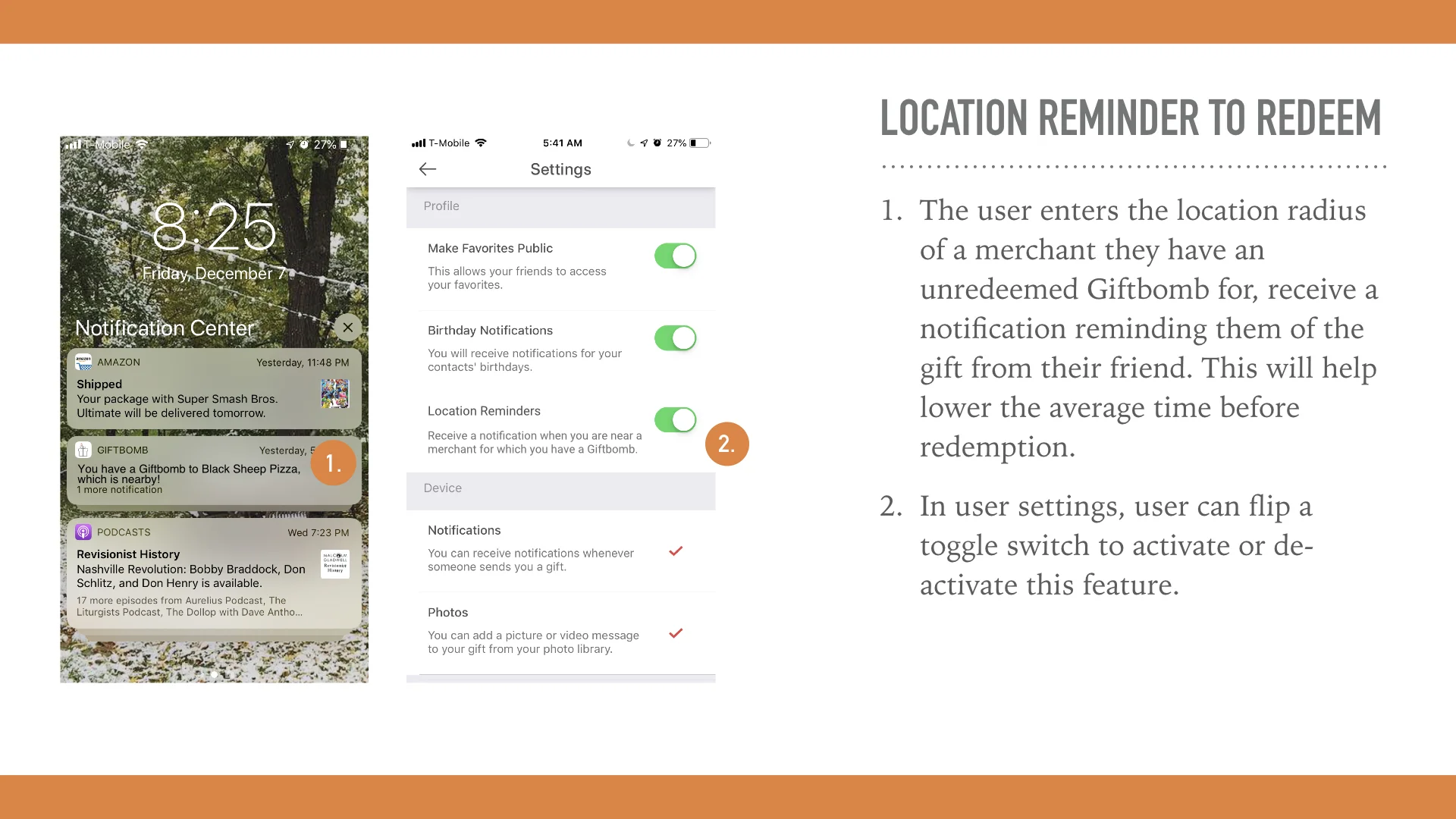 Users take an average of 61 days to redeem a Giftbomb that a friend has sent them. By reminding the user they have a Giftbomb available to spend when they are nearby the merchant, we hope to cut down on the average time to redemption and help current users share positive experiences so that they can help promote and spread Giftbomb to more users.