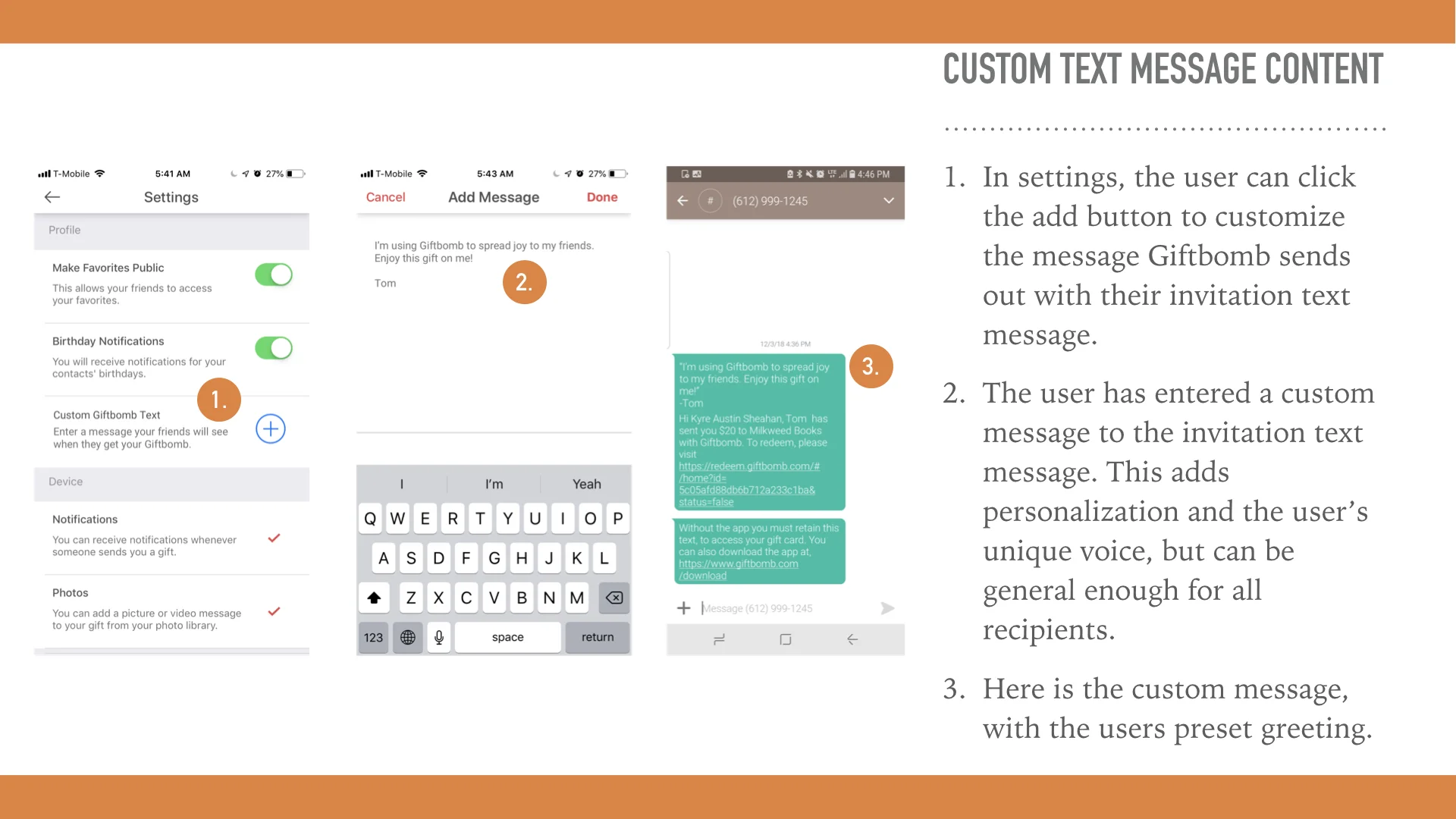 When someone who does not have Giftbomb receives a Giftbomb they receive a computer generated text message from an unknown phone number explaining that a friend has sent them money to a local merchant. Users expressed that they would like it better if this message came from their friend rather than a message delivery service. The developers explained that to have it sent this way would use more resources than were available for this feature rollout. As a compromise This feature allows users to customize a portion of the invitation text message that is sent out with their own voice.